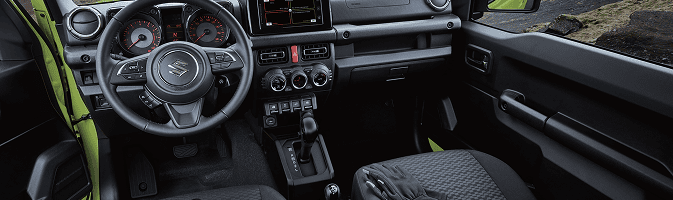 The Jimny 3-Door stays true to its legendary roots as a compact, lightweight, and extremely capable off-road machine. Designed with a rugged, boxy silhouette and a purpose-built ladder-frame chassis, it thrives where regular vehicles hesitate—rocky trails, muddy slopes, and remote wilderness, as shown throughout the brochure imagery (pages 2–4). Inside, the cabin is intentionally simple, functional, and distraction-free, with a black, durable interior and easy-to-use controls built for adventure and challenging environments.