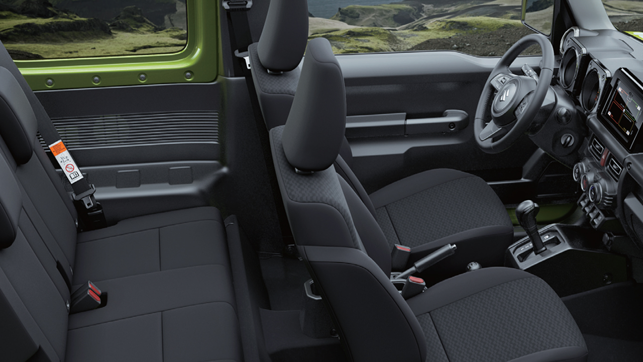 The Jimny 3-Door stays true to its legendary roots as a compact, lightweight, and extremely capable off-road machine. Designed with a rugged, boxy silhouette and a purpose-built ladder-frame chassis, it thrives where regular vehicles hesitate—rocky trails, muddy slopes, and remote wilderness, as shown throughout the brochure imagery (pages 2–4). Inside, the cabin is intentionally simple, functional, and distraction-free, with a black, durable interior and easy-to-use controls built for adventure and challenging environments.