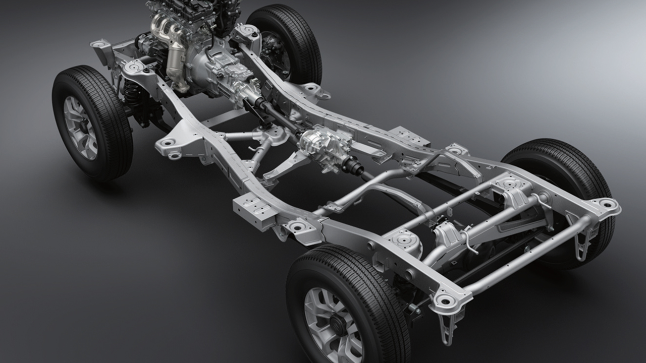 - Sturdy ladder-frame construction and short 2,250 mm wheelbase for superior agility on off-road terrain